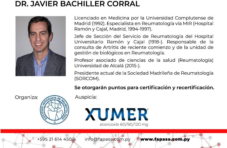 El 13 de mayo de 2020 se realizará un webinar con el tema, “impacto de la infección por coronavirus en los pacientes con enfermedades reumáticas”. Será impartido por el Dr. Javier Bachiller, jefe de sección del Servicio de Reumatología del hospital Universitario Ramón y Cajal de Madrid, España. Compartirá su experiencia en la pandemia por COVID-19.
